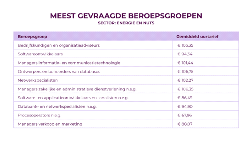 Binnen de energie- en nutssector richt de vraag naar externe professionals zich vooral op bedrijfskundigen en organisatieadviseurs. Deze groep zelfstandigen rekent gemiddeld €105,35 per uur.